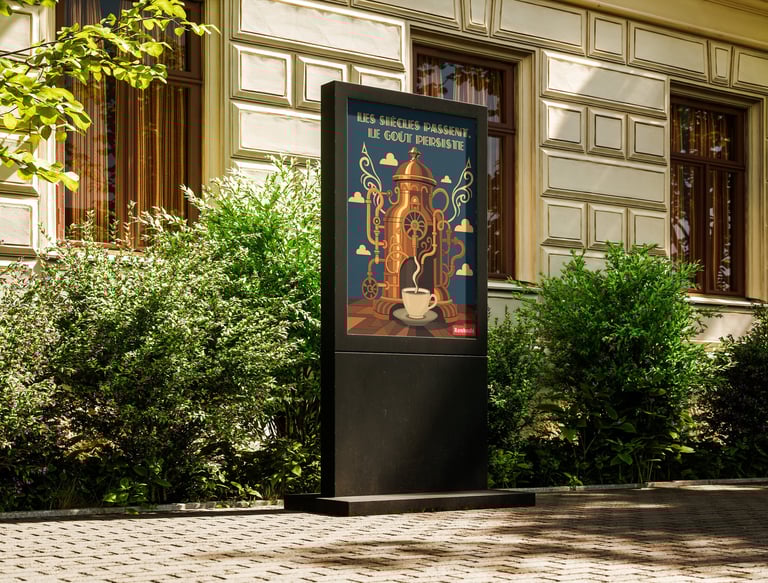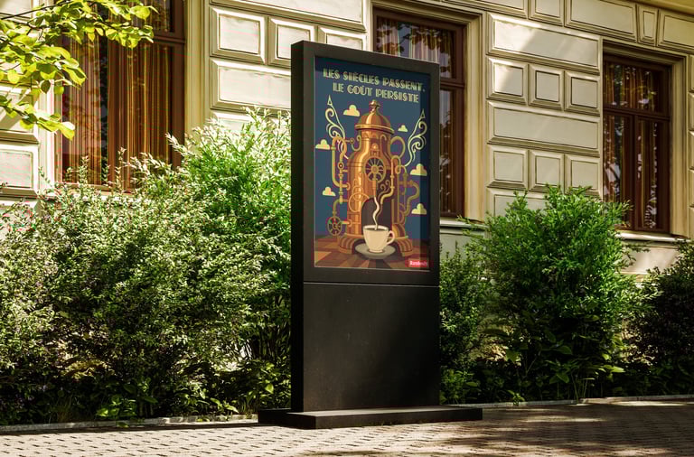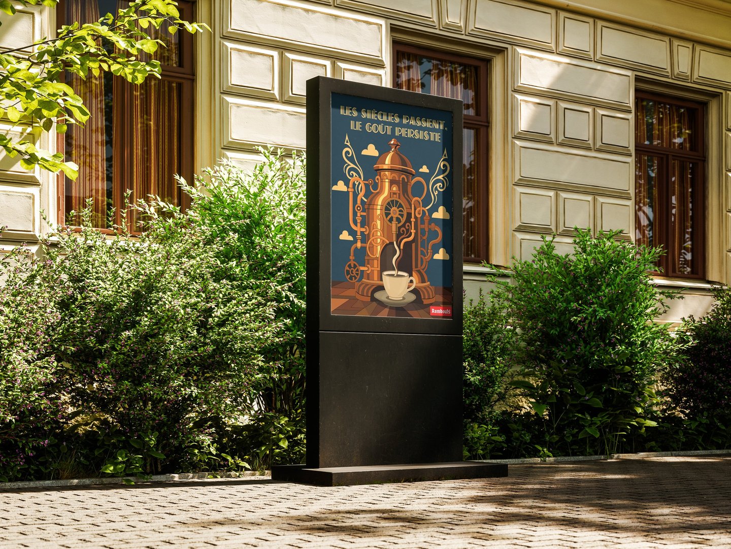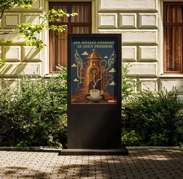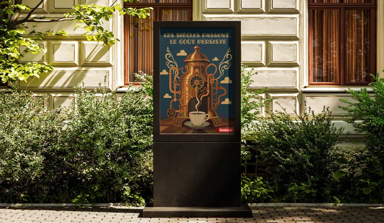 Dans le cadre du concours « Arômes Illustrés » organisé par la SABAM, j'ai conçu une affiche pour le Café Rombouts inspirée de l'Art Déco. Une machine à café monumentale, aux courbes ornementales et aux teintes cuivrées, comme une cathédrale du goût. Le slogan « Les siècles passent, le goût persiste » ancre l'univers dans la nostalgie des années 1920 tout en célébrant l'intemporalité d'un rituel. Pas de superflu, juste l'élégance d'une époque réinventée.
